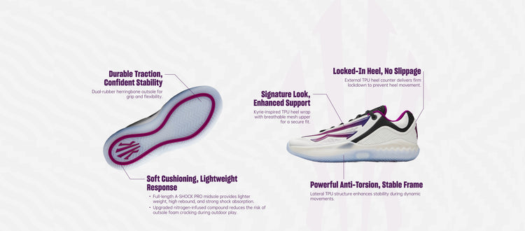 ANTA KAI 2 SPEED delivers fast acceleration with A-SHOCK PRO cushioning, dual-rubber traction, and Kyrie-inspired support. Built for quick cuts and all-court control.